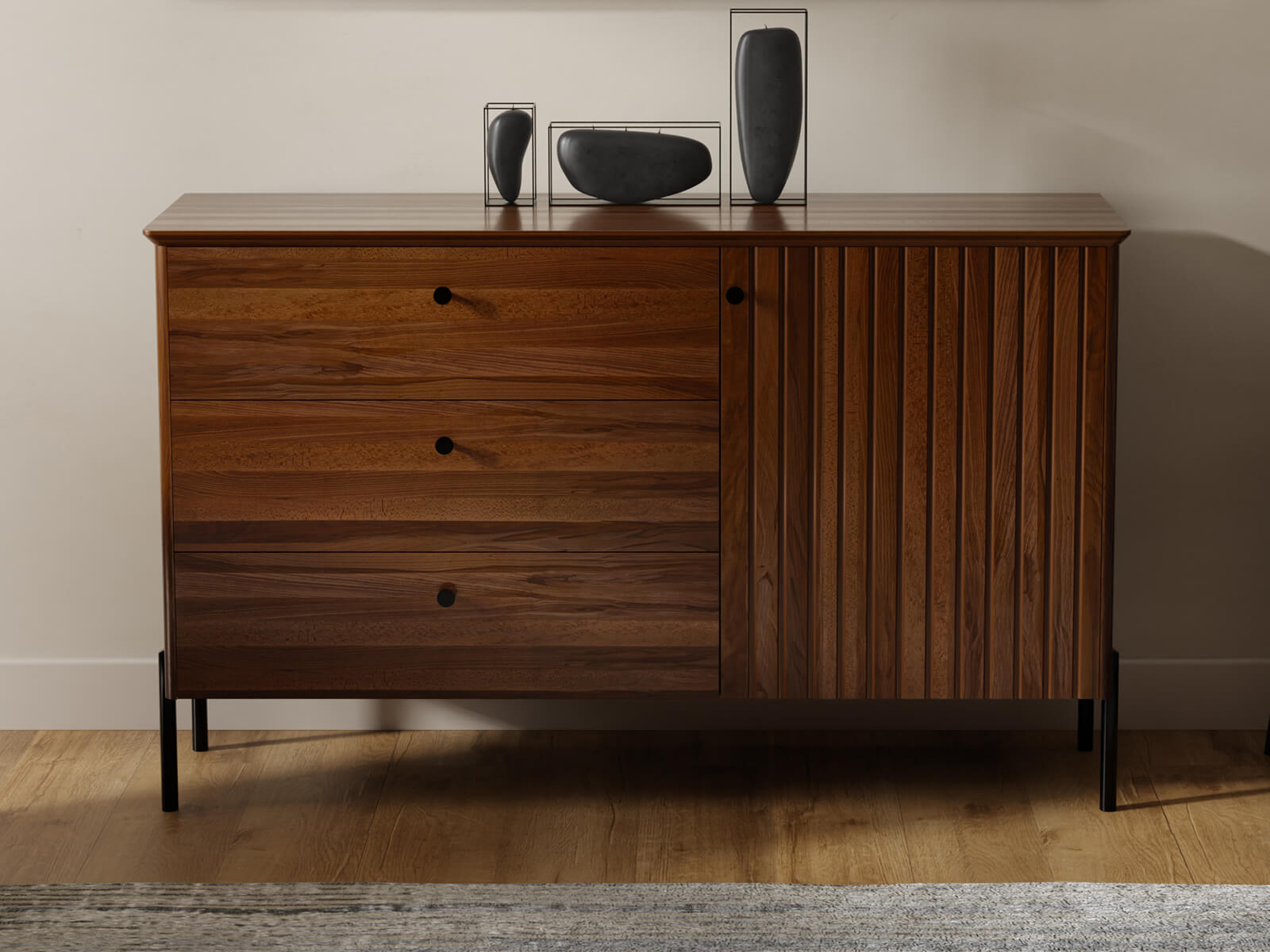 Výjimečná lehkost – Klíčovým designovým prvkem jsou černé kovové nohy, které zajišťují stabilitu, zatímco jejich štíhlost a výška dodávají celému kusu vizuální lehkost. Efekt „vznášení“ dodává příborníku decentní a moderní vzhled, a to i v menších prostorech. Je to hra kontrastů, která dodává aranžmá hloubku a charakter.