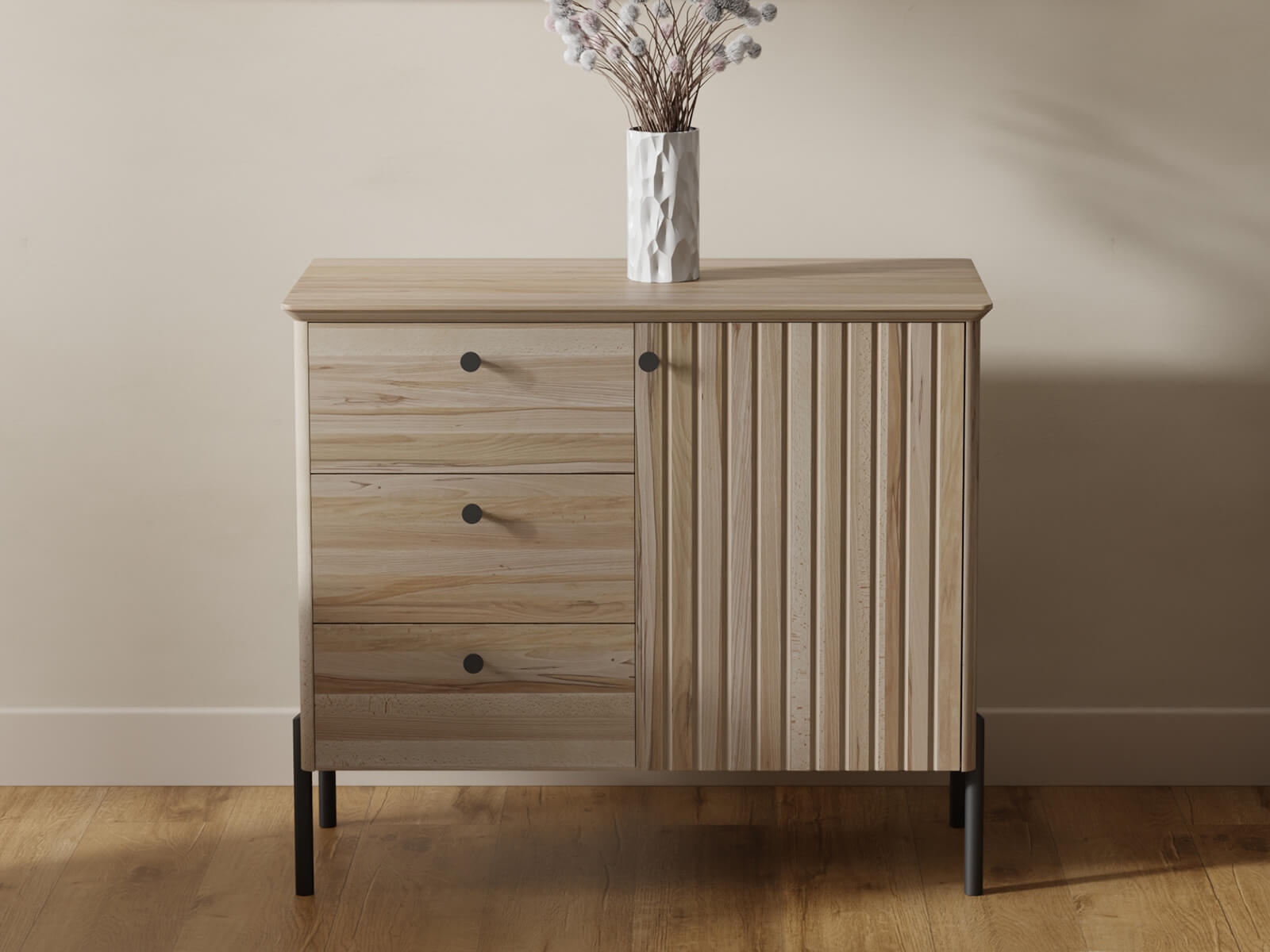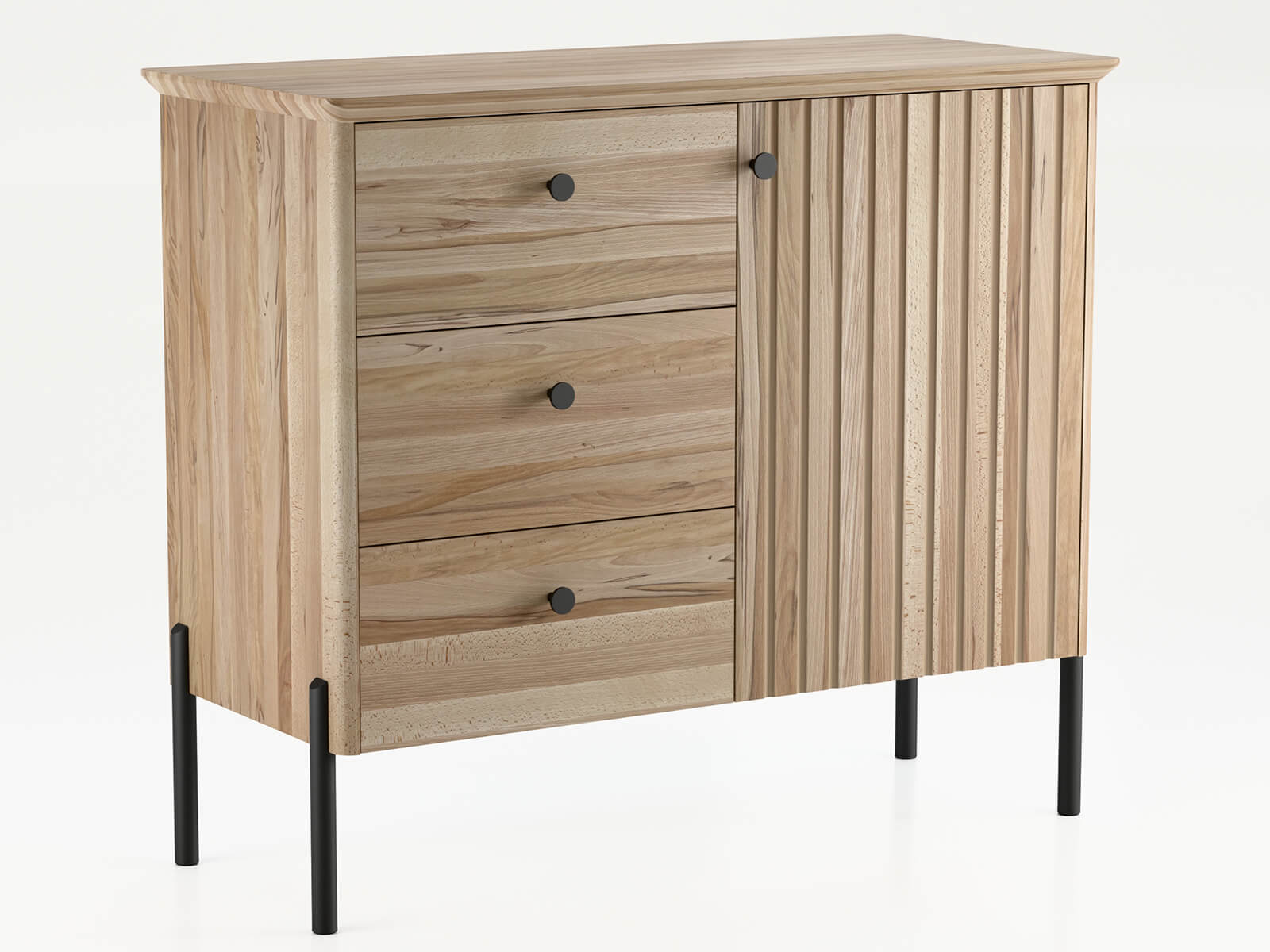 Robustnost a funkčnost - díky promyšlenému designu kombinujícímu přirozenou odolnost bukového dřeva, stabilní kovové nohy a praktická řešení, jako jsou prostorné zásuvky a uzamykatelné skříňky, nabízí komoda Lamelo nejen dostatek úložného prostoru, ale také spolehlivost a pohodlí při používání po mnoho let.