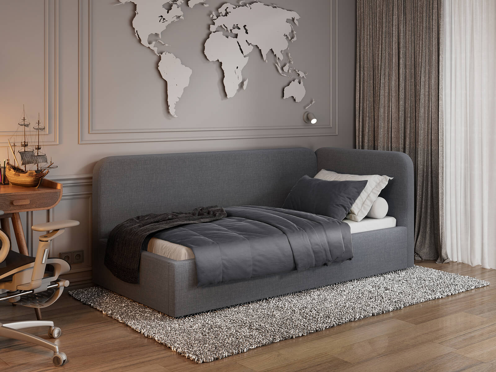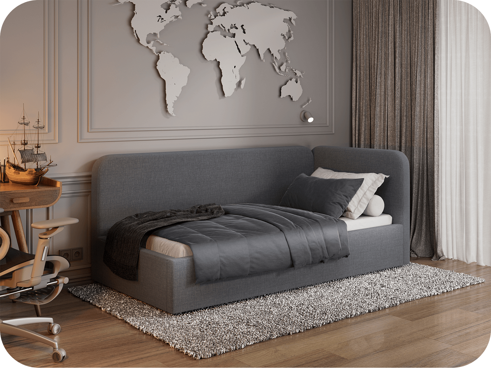 Měkké čalouněné opěradlo zvyšuje komfort každodenního používání, díky čemuž může postel Leo přes den sloužit jako pohovka a večer se promění v pohodlné lůžko 90x200. Stabilní konstrukce a precizní zpracování detailů podtrhují její moderní charakter.