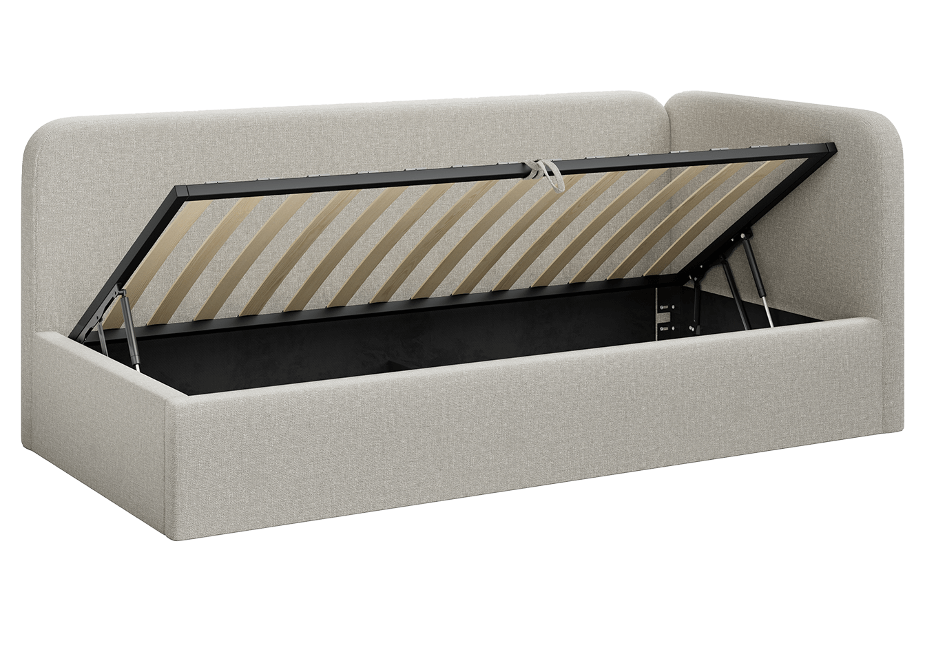 Další výhodou modelu Leo je zvedací rošt s kovovým rámem a prostorný úložný prostor na lůžkoviny. Navíc možnost montáže boční police na pravou nebo levou stranu činí postel plně oboustrannou a univerzální, takže ji snadno přizpůsobíte uspořádání vašeho interiéru.