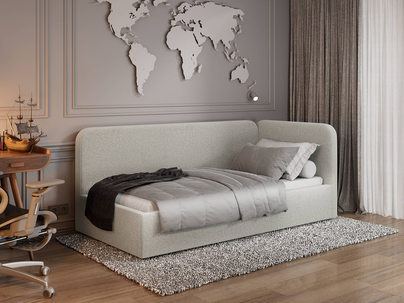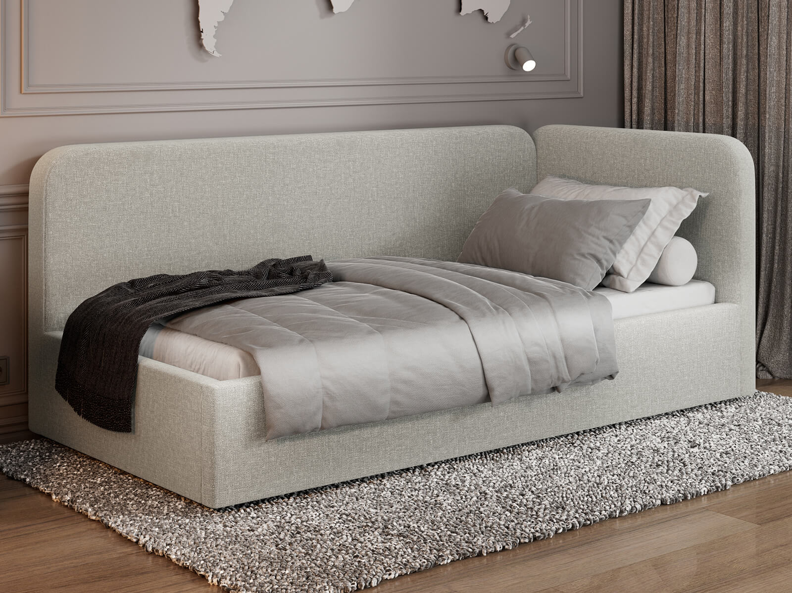 Měkké čalouněné opěradlo zvyšuje komfort každodenního používání, díky čemuž může postel Leo přes den sloužit jako pohovka a večer se promění v pohodlné lůžko 90x200. Stabilní konstrukce a precizní zpracování detailů podtrhují její moderní charakter.