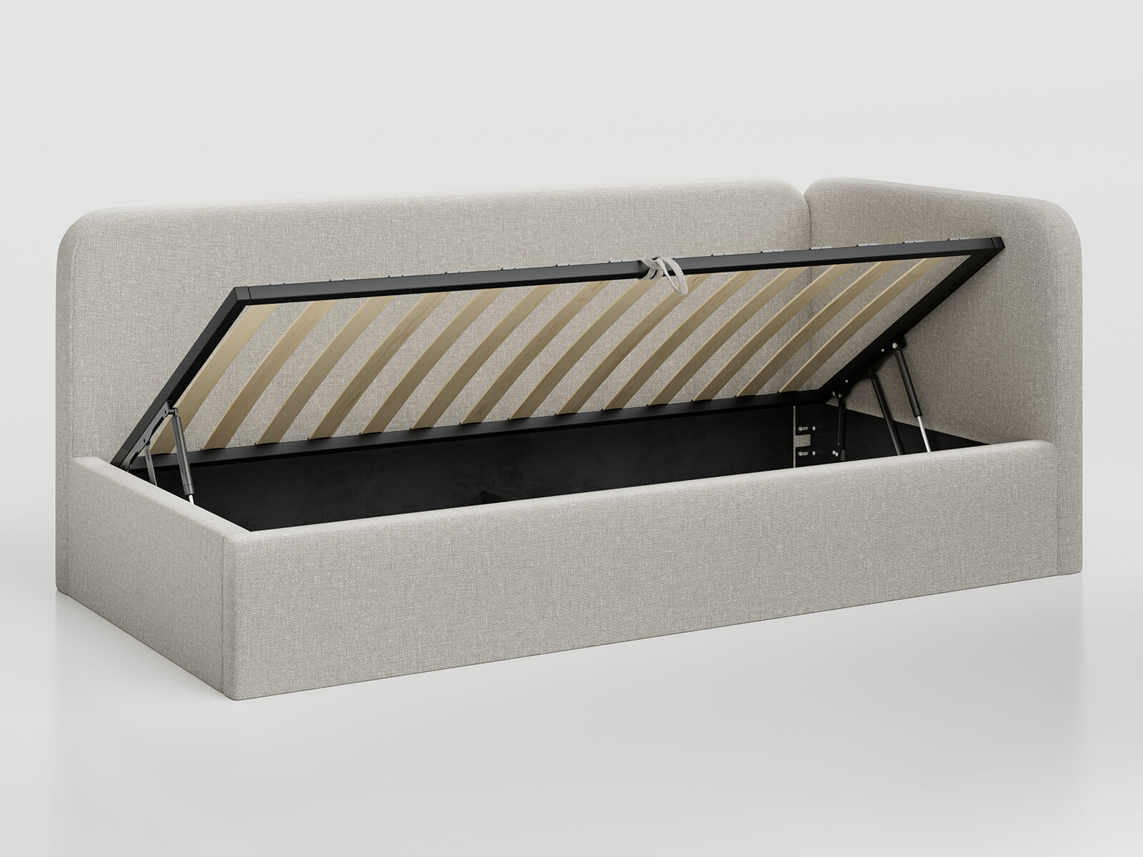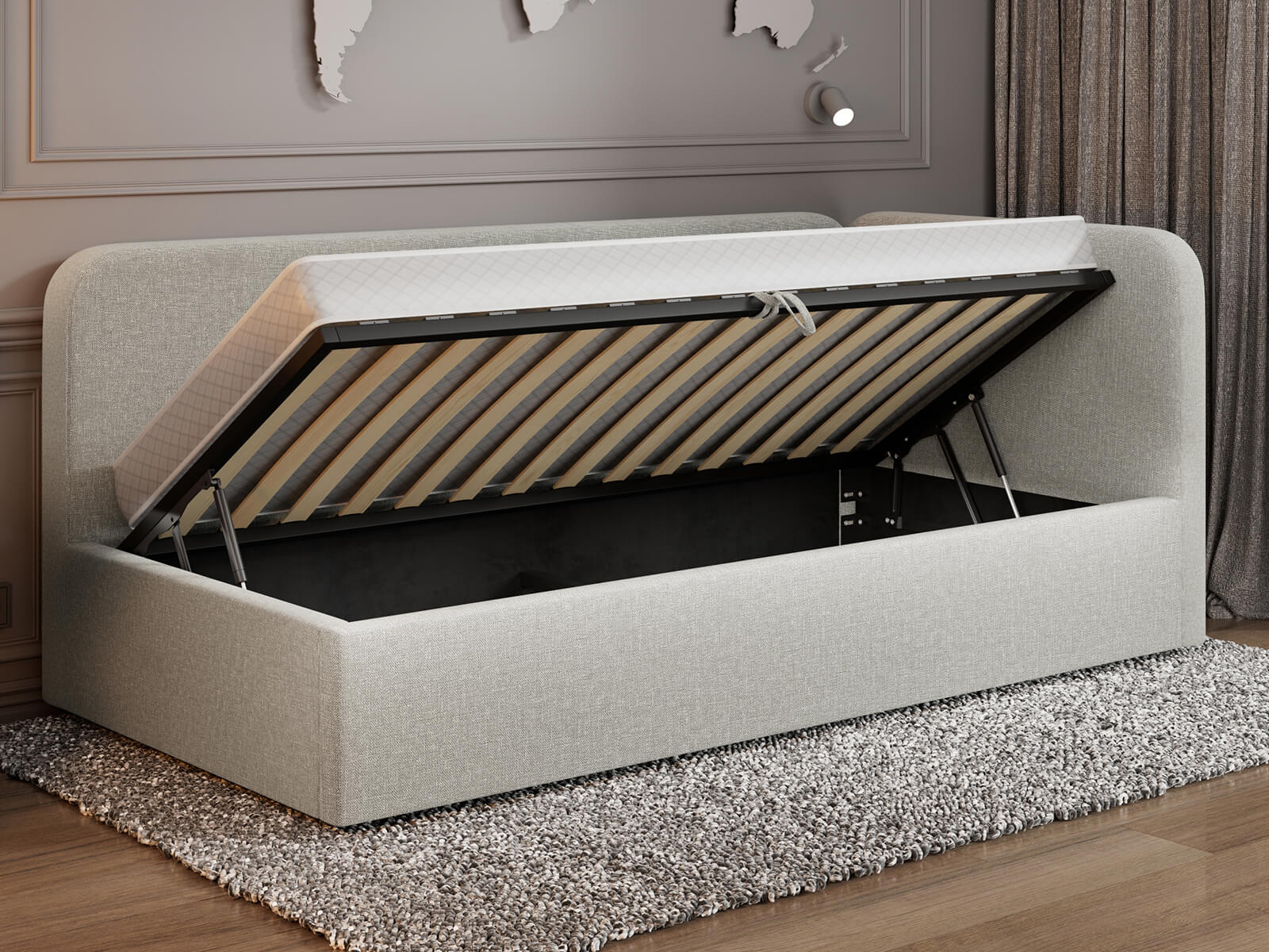 Zvedací rošt – Stabilní kovový rám a mechanismus zvedání zajišťují snadný přístup k prostornému úložnému prostoru.