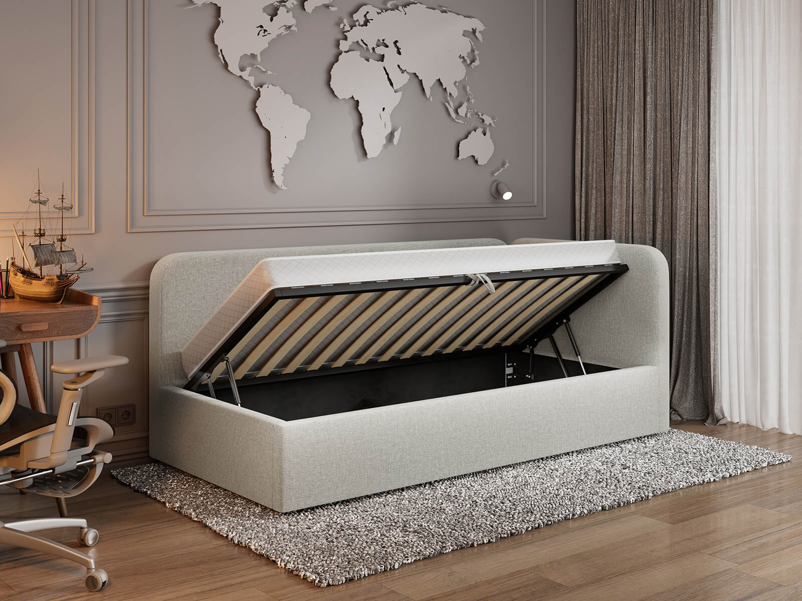 Jedná se o odolnou a estetickou čalouněnou jednolůžkovou postel s úložným prostorem, navrženou s důrazem na každodenní komfort a maximální využití prostoru.