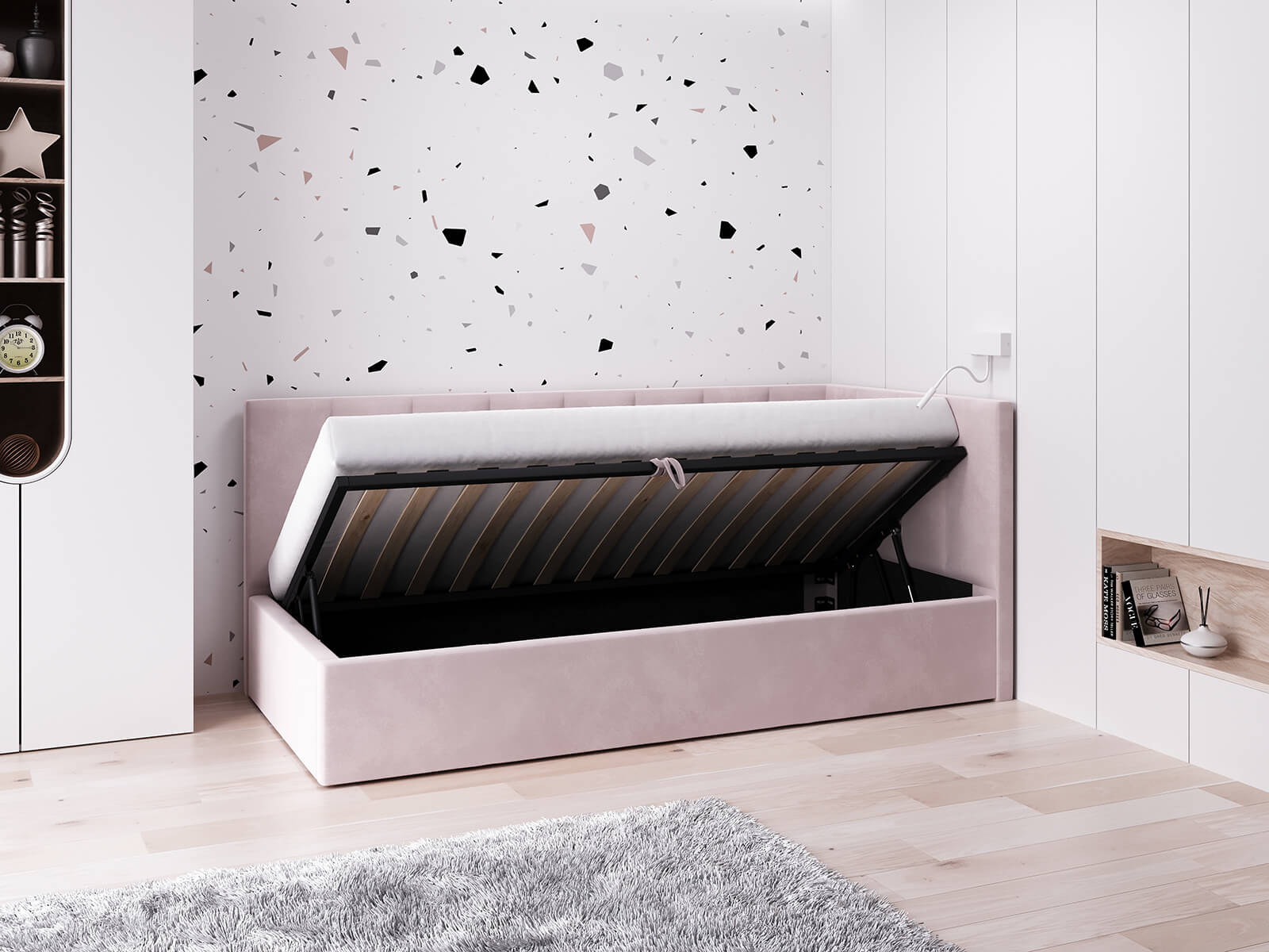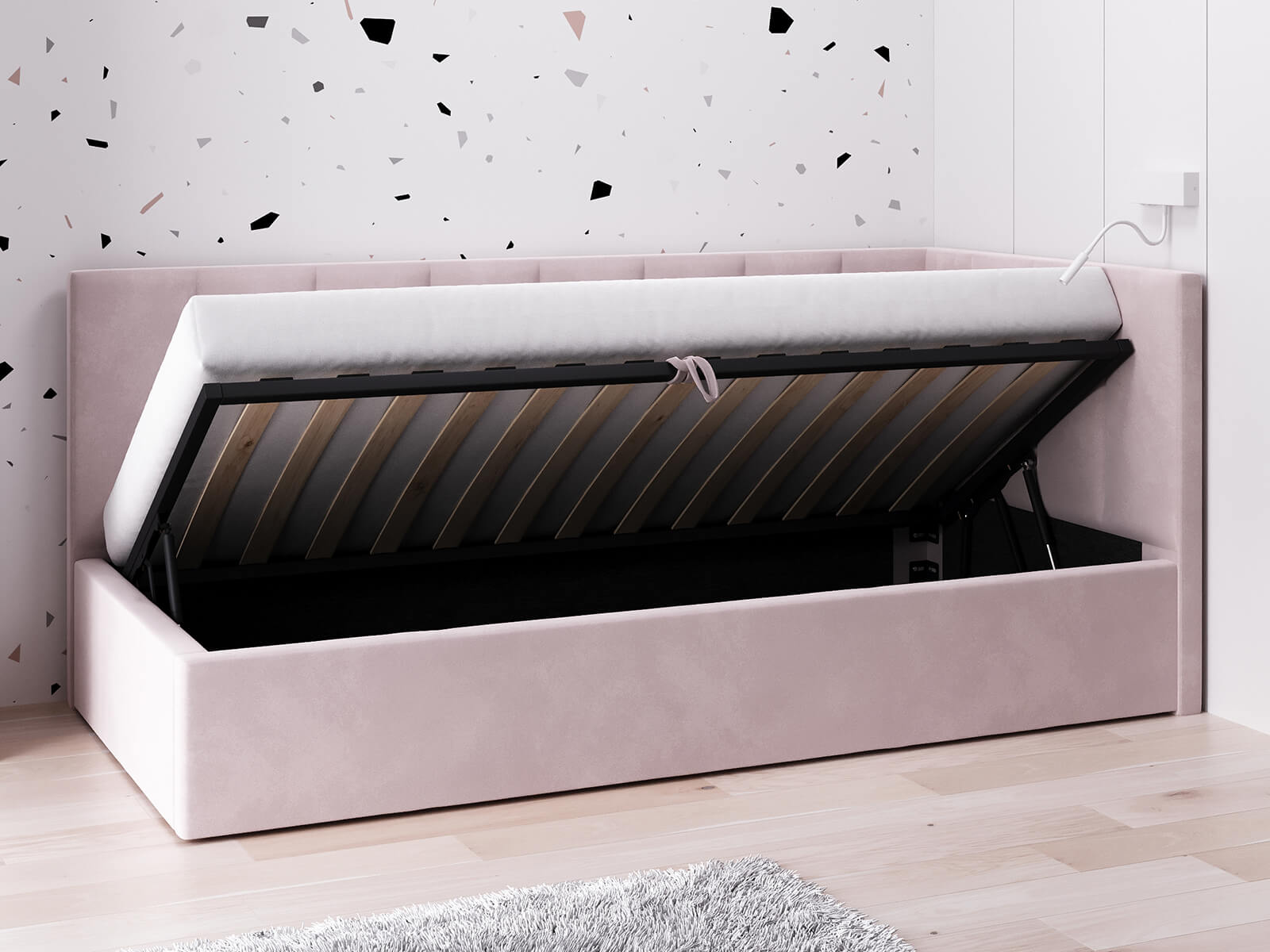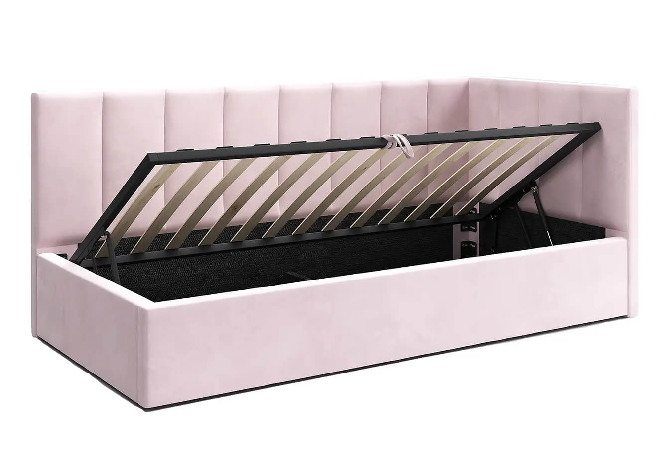 Čalouněná jednolůžková pohovka s roštem a úložným prostorem 90x200, Tom Růžový Velvet