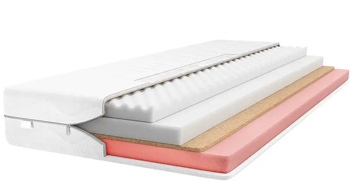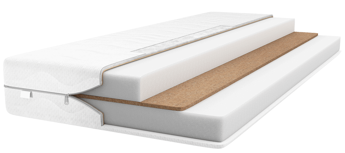 Dvě vrstvy polyuretanové pěny oddělené vrstvou kokosové rohože. Kokosová vlákna zvyšují tvrdost a stabilitu a poskytují dostatečnou oporu páteři. Vybaveno měkkým potahem se zipem, který lze snadno sundat a vyprat. Výška matrace 8 cm. Hypoalergenní materiály.