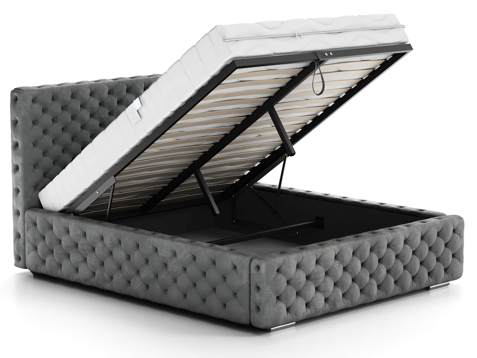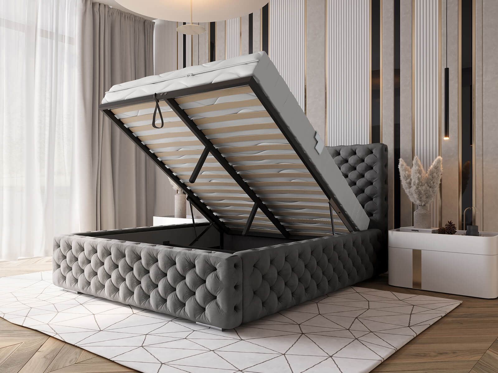 Díky vestavěnému rámu na plynových zvedácích 600N s kontejnerem na lůžkoviny je udržování pořádku v ložnici snadné a efektivní.