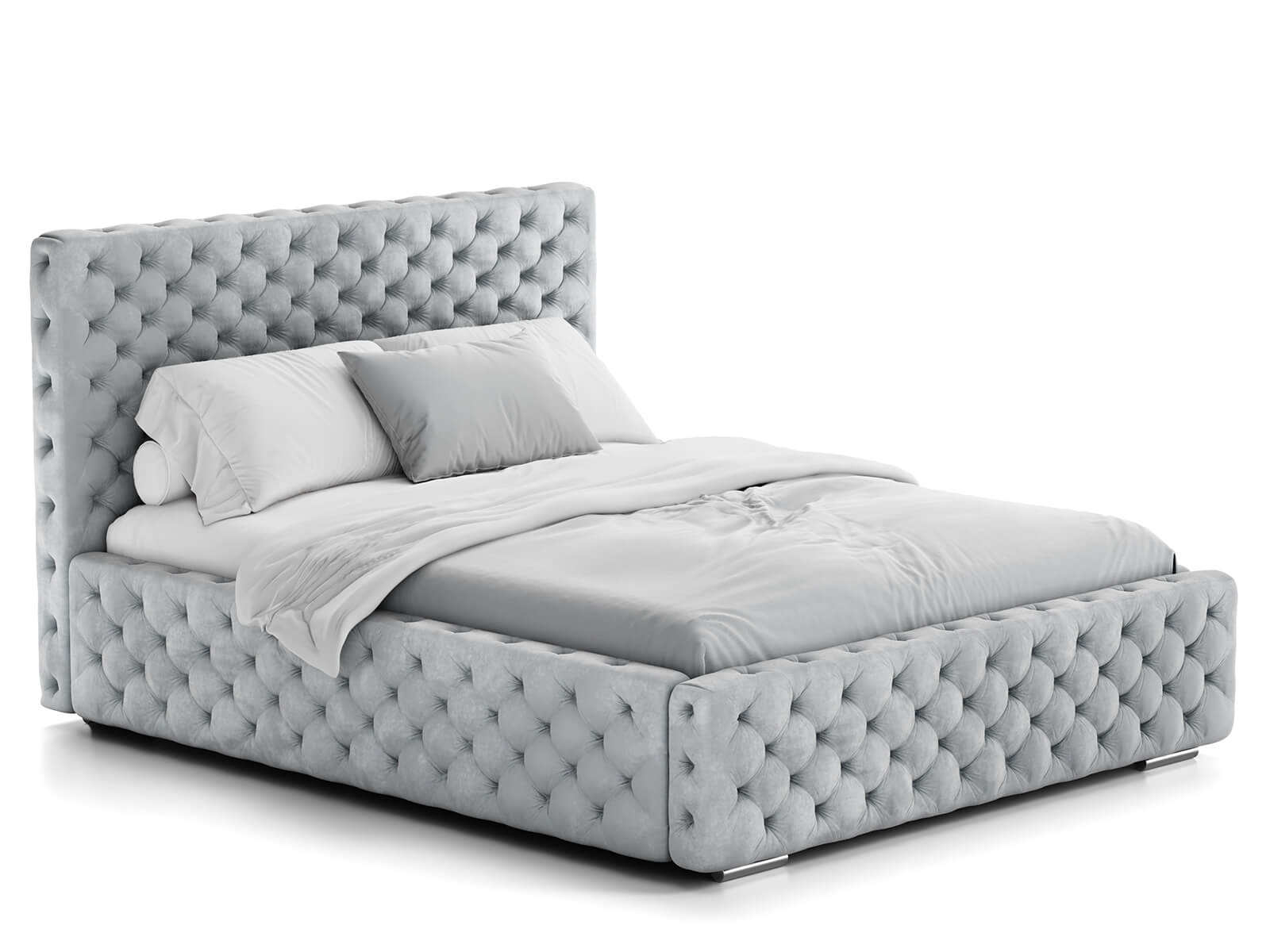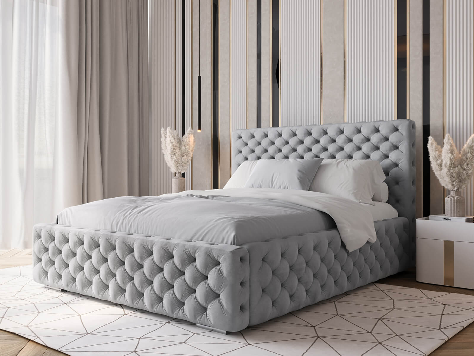 Měkká sametová látka s hlubokým prošíváním dodává posteli jedinečný charakter a vytváří poutavý kus nábytku, který vynikne v každém aranžmá.