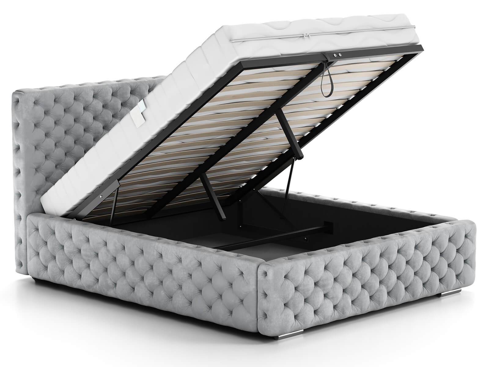 Díky vestavěnému rámu na plynových zvedácích 600N s kontejnerem na lůžkoviny je udržování pořádku v ložnici snadné a efektivní.
