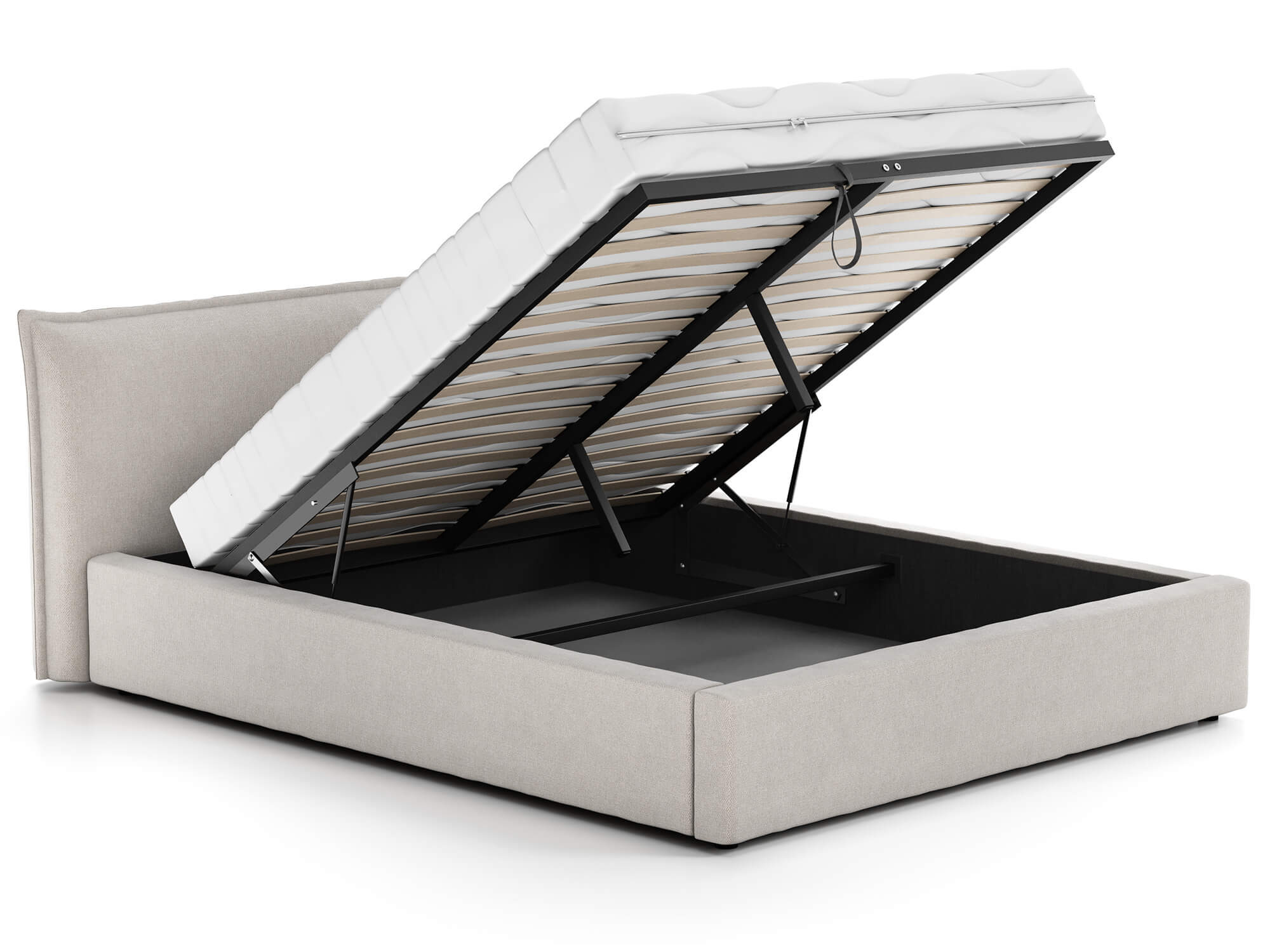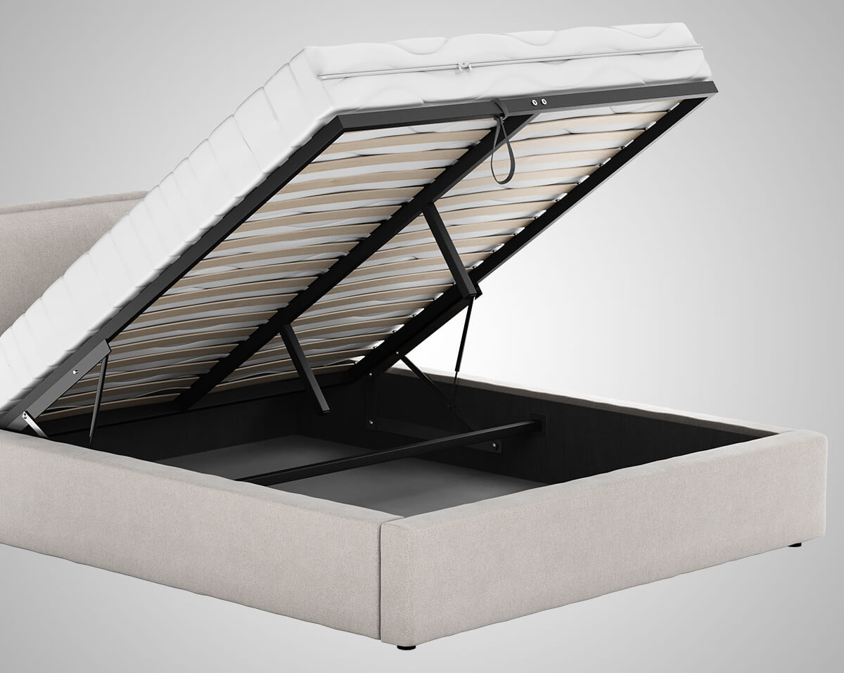 Díky vestavěnému rámu na plynových zvedácích 70N s kontejnerem na lůžkoviny je udržování pořádku v ložnici snadné a efektivní.