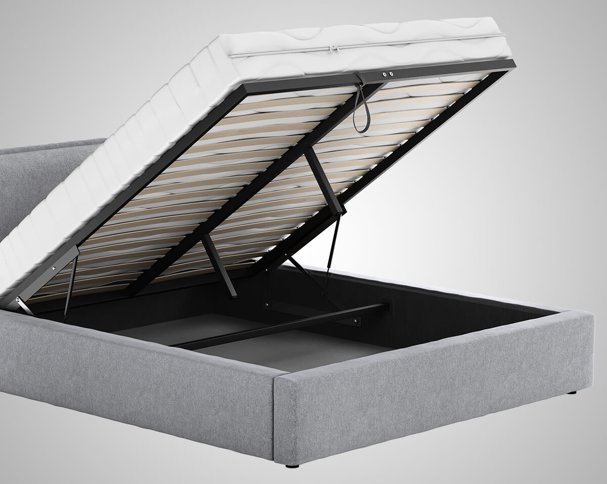 Díky vestavěnému rámu na plynových zvedácích 70N s kontejnerem na lůžkoviny je udržování pořádku v ložnici snadné a efektivní.