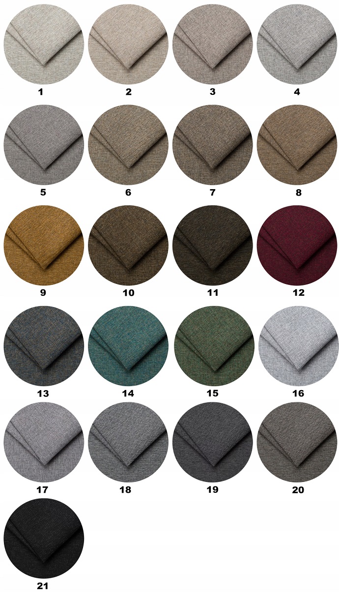 Ze dvou druhů látek a rozsáhlé palety barev lze vytvořit celou řadu verzí židle, které lze ještě více přizpůsobit interiéru. Při konfiguraci výrobku si vyberte jeden ze vzorů a při zadávání objednávky uveďte do informací číslo barvy.