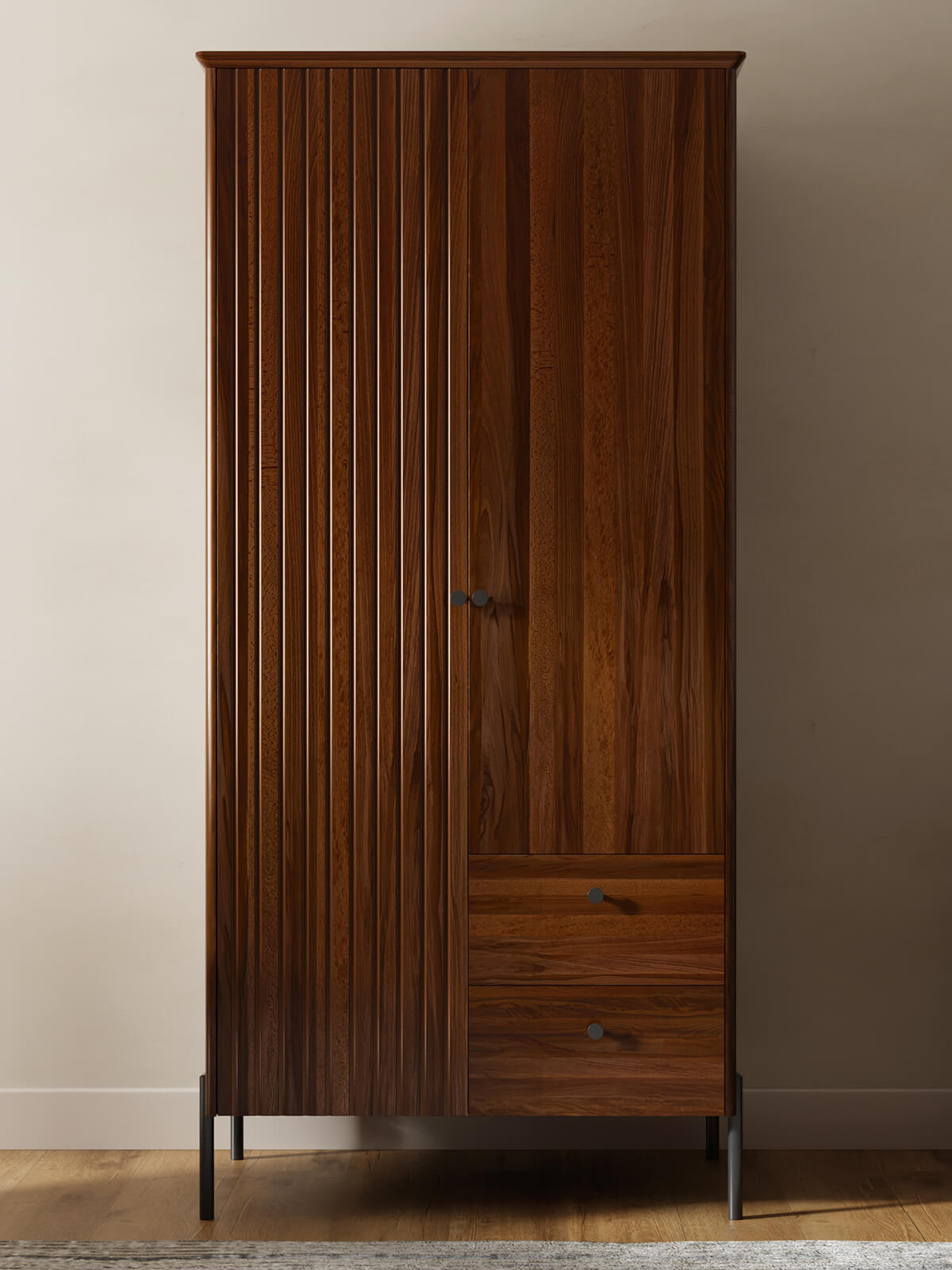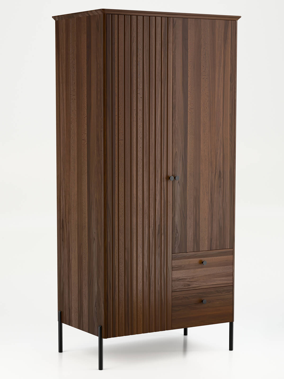 Výjimečná lehkost – Klíčovým designovým prvkem jsou černé kovové nohy, které zajišťují stabilitu, zatímco jejich štíhlost a výška dodávají celému kusu vizuální lehkost. Efekt „vznášení“ dodává šatní skříni decentní a moderní vzhled, a to i v menších prostorech. Je to hra kontrastů, která dodává uspořádání hloubku a charakter.