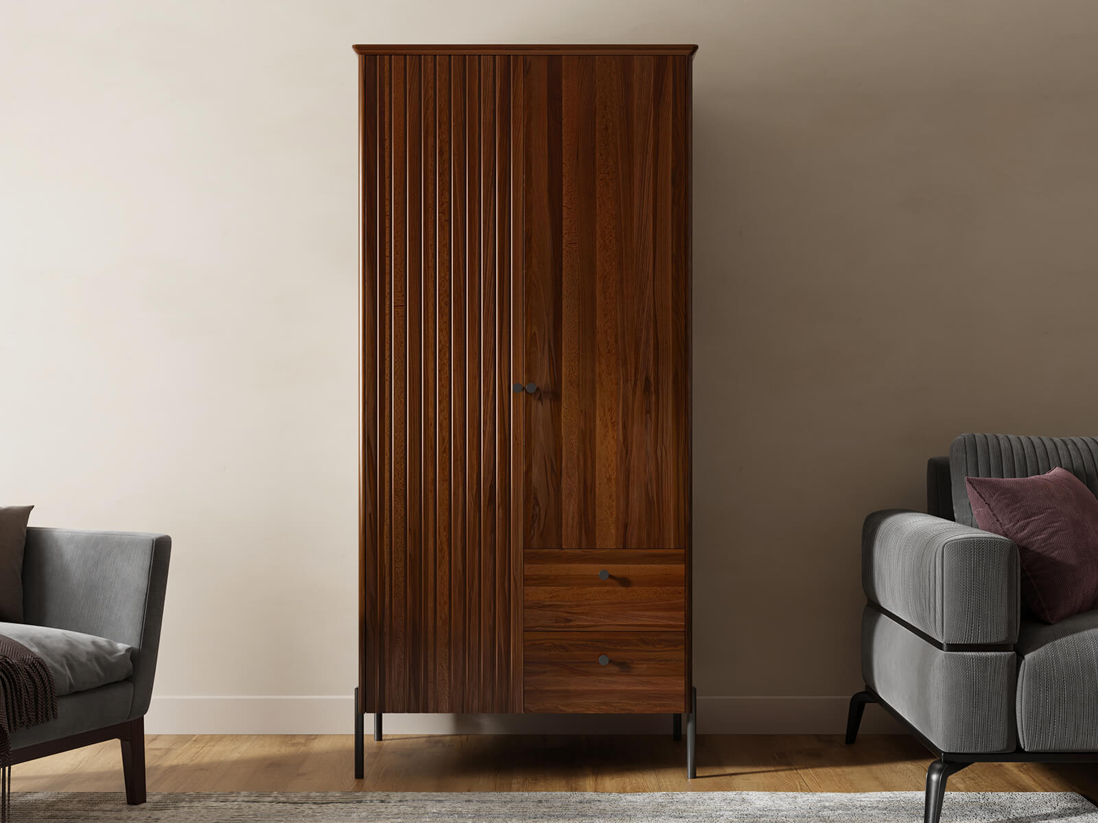 Univerzální design – Skříň Lamelo je perfektním doplňkem do ložnice, šatny, moderní chodby nebo pracovny. Její harmonický tvar a propracované detaily ji činí snadno přizpůsobitelnou různým stylům interiéru – od skandinávské jednoduchosti, přes strohost loftového stylu, až po klasickou eleganci. Je to kus nábytku, který vždy vypadá dobře – bez ohledu na okolí.