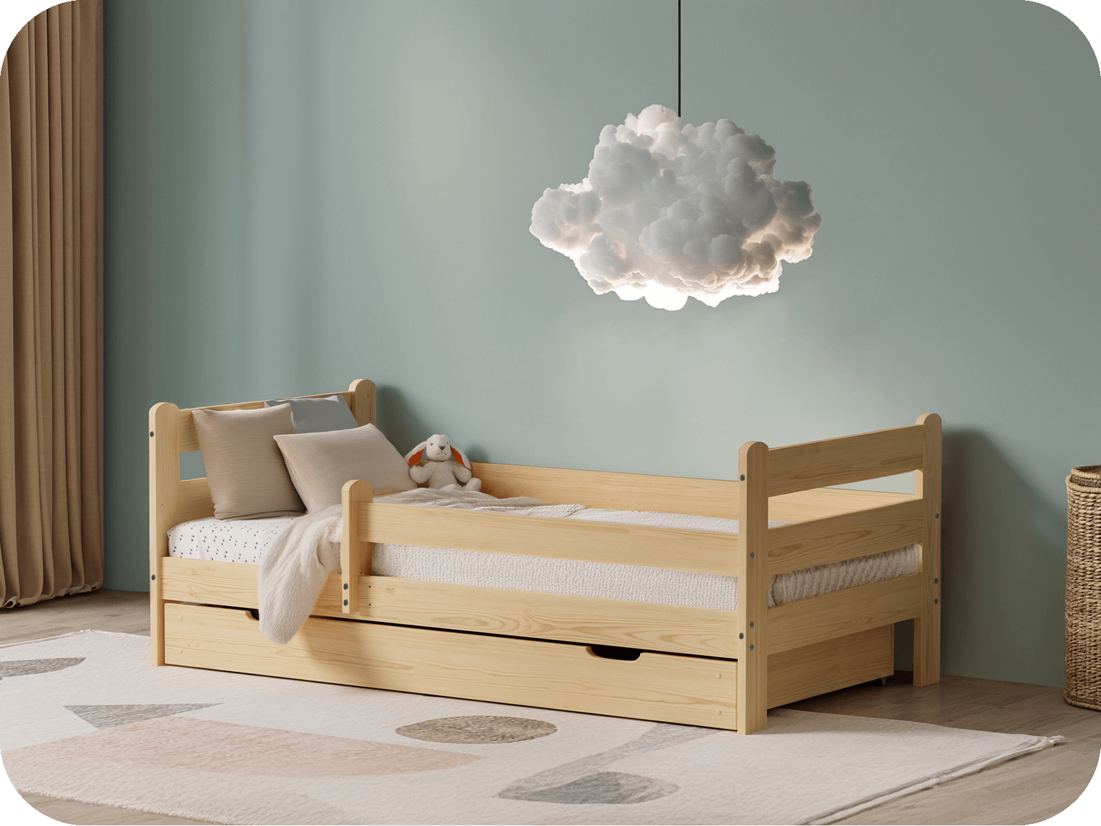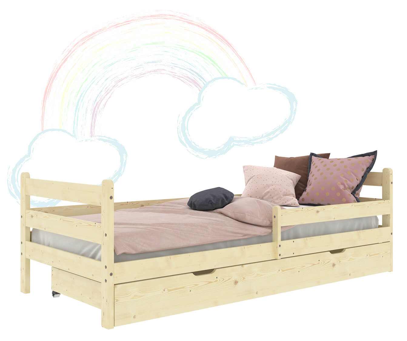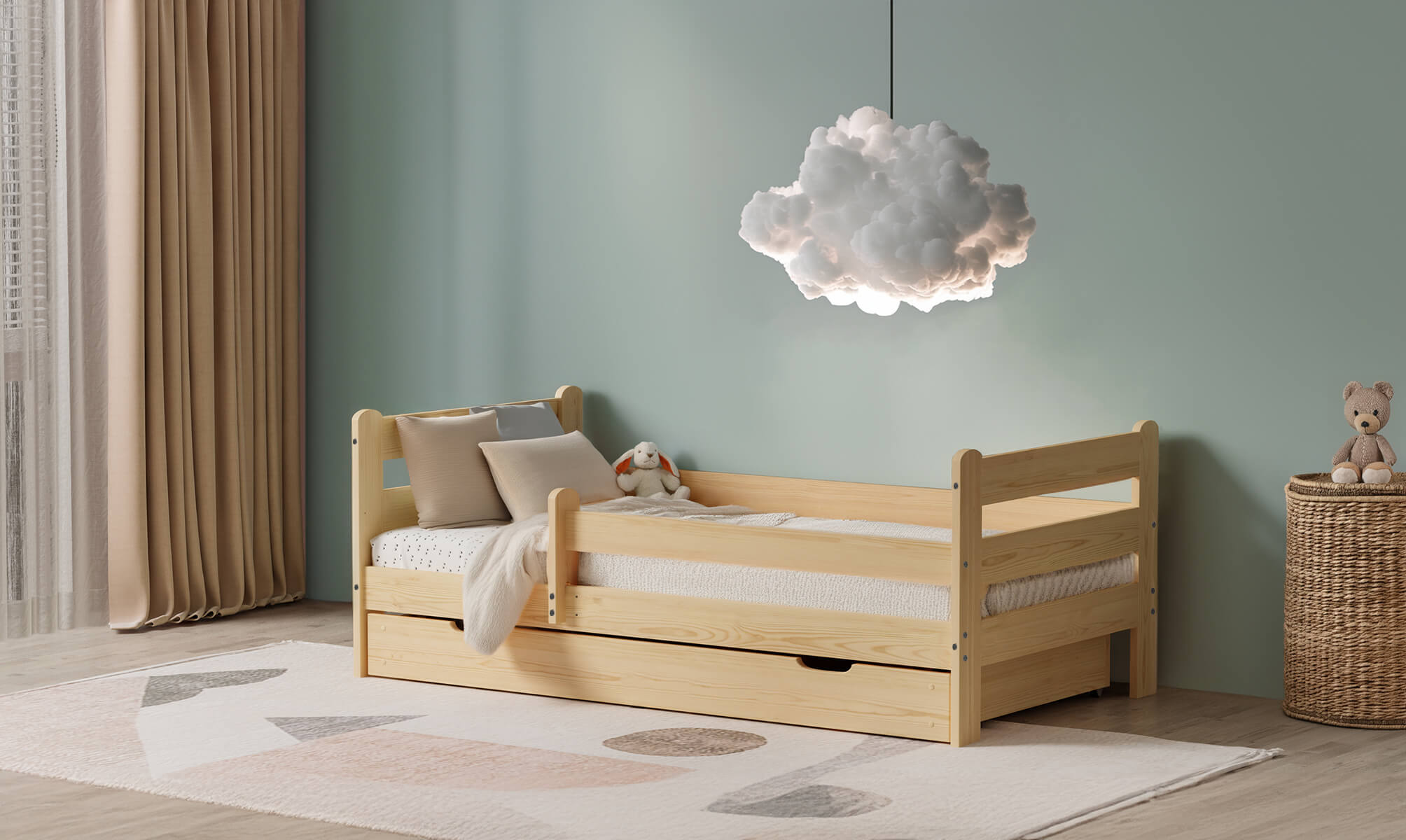 Díky možnosti instalace zábradlí na pravou nebo levou stranu můžete klidně spát s vědomím, že vaše dítě spí bezpečně. Rukojeť poskytuje dodatečnou ochranu, dokud nebude vaše dítě připraveno usnout samo. Naše postel Kacperek je navíc vybavena zásuvkou na kolečkách, která umožňuje snadný přístup k uloženým věcem a zároveň šetří cenný prostor v místnosti.