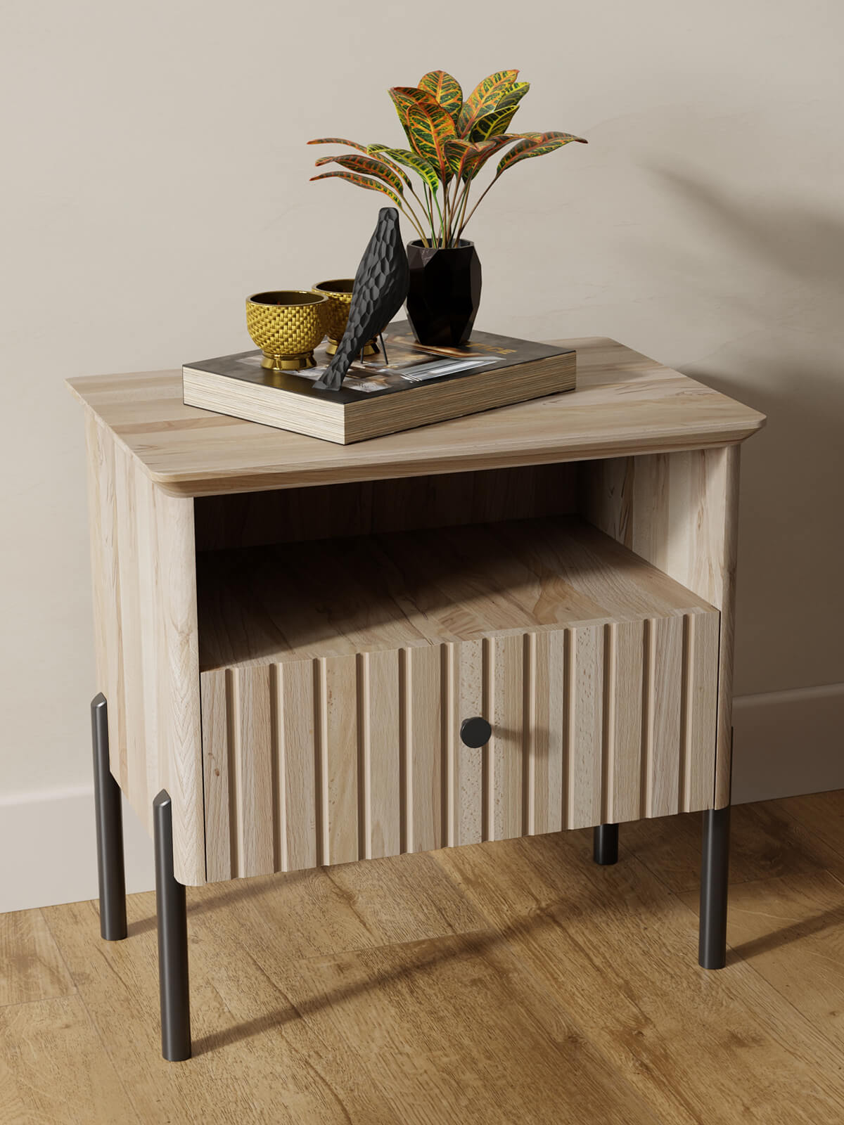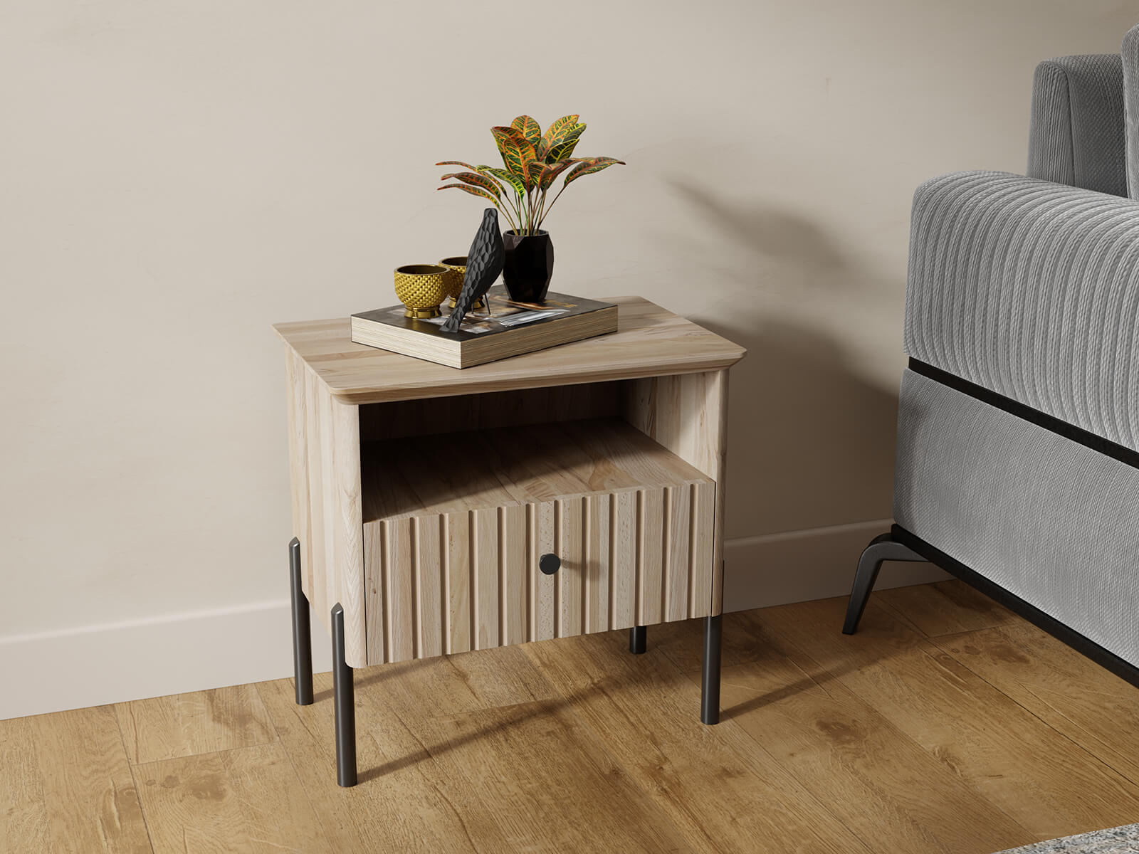 Všestranný design – noční stolek Lamelo se perfektně hodí do moderních, minimalistických ložnic, ale i do klasických, skandinávských a loftových interiérů. Jeho nadčasový tvar a dekorativní detaily z něj činí harmonický doplněk do nejrůznějších interiérů a dodávají mu eleganci a sofistikovanost.