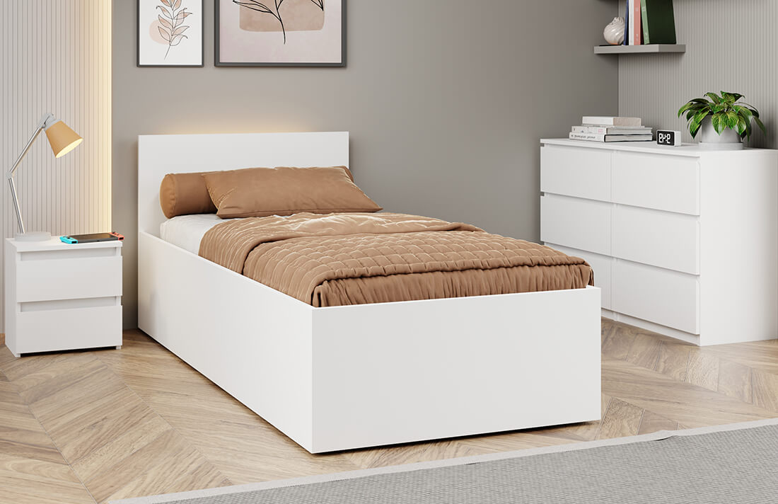 o produktuPostel DM1 v bílé barvě je moderní a funkční kus nábytku vyrobený z odolné nábytkové desky, který se vyznačuje jednoduchým, minimalistickým designem. Světlý odstín dodává interiéru moderní a stylový charakter a skvěle se hodí k různým stylům zařízení. Odolná a bezpečná konstrukce a pohodlné čelo zajišťují komfort při používání, zatímco univerzální design umožňuje, aby se postel skvěle hodila do ložnice, dětského či hostinského pokoje. Je to praktické řešení pro ty, kteří oceňují spojení estetiky a odolnosti. Kompaktní rozměr postele ji navíc činí ideální volbou do menších prostor bez ztráty funkčnosti. Stabilní konstrukce a precizní zpracování zajišťují bezpečnost i při intenzivním používání. Přírodní povrch s dekorem dřeva je nejen estetický, ale také snadno udržovatelný, což umožňuje udržet nábytek v perfektním stavu po dlouhou dobu. Postel DM1 představuje spojení klasické elegance s moderním přístupem ke komfortu a praktičnosti.