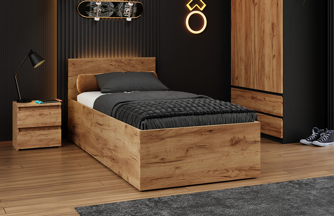 o produktuPostel DM1 v craft barvě je moderní a funkční kus nábytku vyrobený z odolné nábytkové desky, který se vyznačuje jednoduchým, minimalistickým designem. Světlý odstín dodává interiéru moderní a stylový charakter a skvěle se hodí k různým stylům zařízení. Odolná a bezpečná konstrukce a pohodlné čelo zajišťují komfort při používání, zatímco univerzální design umožňuje, aby se postel skvěle hodila do ložnice, dětského či hostinského pokoje. Je to praktické řešení pro ty, kteří oceňují spojení estetiky a odolnosti. Kompaktní rozměr postele ji navíc činí ideální volbou do menších prostor bez ztráty funkčnosti. Stabilní konstrukce a precizní zpracování zajišťují bezpečnost i při intenzivním používání. Přírodní povrch s dekorem dřeva je nejen estetický, ale také snadno udržovatelný, což umožňuje udržet nábytek v perfektním stavu po dlouhou dobu. Postel DM1 představuje spojení klasické elegance s moderním přístupem ke komfortu a praktičnosti.